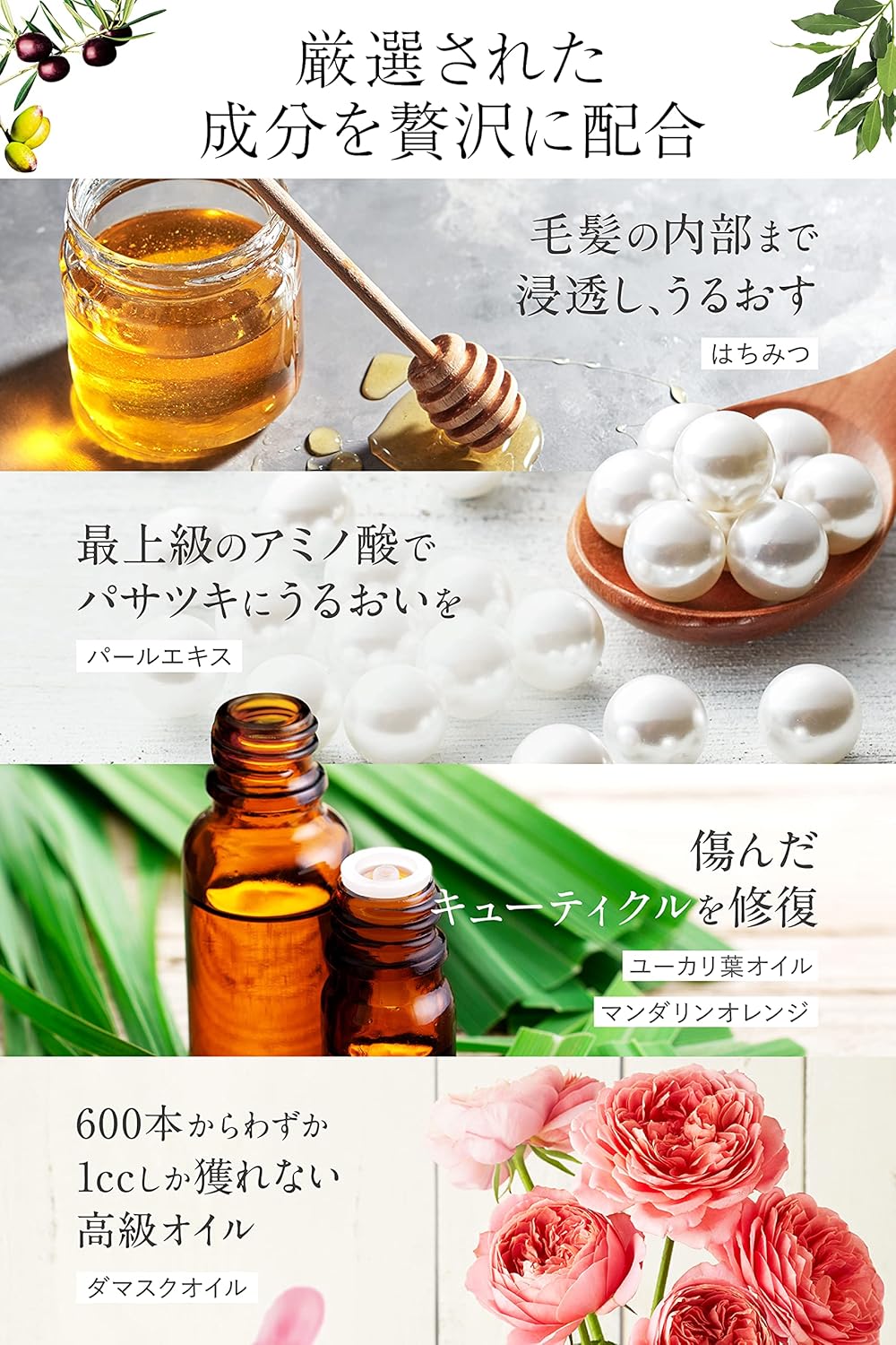 水、グリセリン、ミリスチルアルコール、オクチルドデカノール、ドデカン、ベヘニルアルコール、ステアラミドプロピルジメチルアミン、安息香酸アルキル(C12-15)、ステアルトリモニウムプロミド、ハイブリッドサフラワー油、フェノキシエタノール、イソプロパノール、イソステアリン酸水添ヒマシ油、ポリソルベート60、香料、クエン酸、BG、オリーブ果実油、アルガニアスピノサ核油、ダマスクバラ花水、はちみつ、ベントナイト、アーモンド油、マカデミア種子油、ローズマリー葉エキス、レモングラス葉/茎エキス、ラベンダー花エキス、加水分解コンキオリン、トコフェロール
